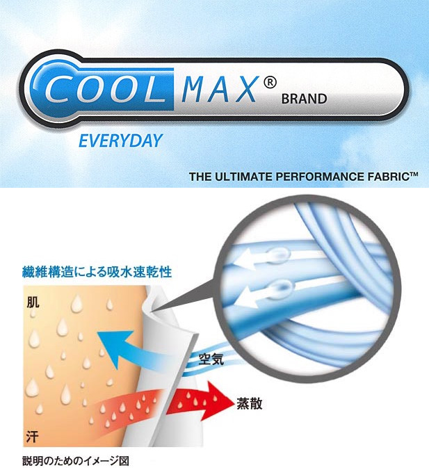 吸湿速乾の機能的素材、クールマックスを使用。通気性が高く、涼しく柔らかい素材です。吸水速乾性にも優れています。