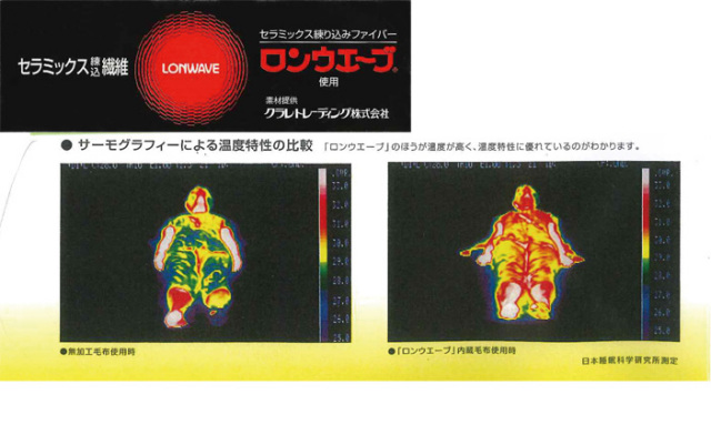 ロンウエーブは遠赤外線の放射の高いセラミックスを、クラレが開発した特殊技術でポリエステルに練り込んだ遠赤外線放射性セラミックス練り込みファイバー生地です。