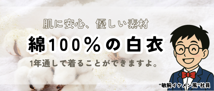 そんな化学繊維が苦手な方におすすめなのが、綿100%を使った肌に優しい白衣。