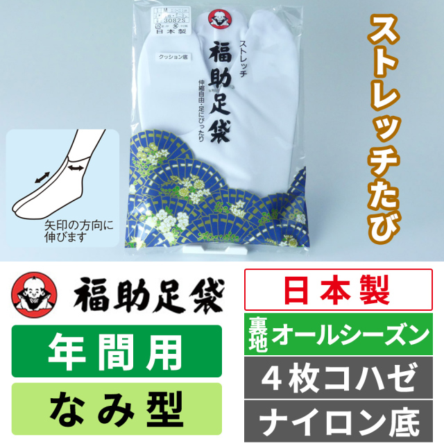 ■ 福助足袋 ストレッチたび オールシーズン/なみ型/4枚コハゼ/ナイロン底/伸びる足袋/年間用【白足袋】